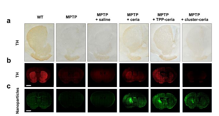 The nanoparticles delivered to a part of the brain, called corpus striatum, in mouse models improved the typical signs of Parkinson’s disease: neuro-inflammation, oxidative stress, and diminishing level of the enzyme tyrosine hydroxylase – a hallmark of Parkinson’s disease – which produces a dopamine precursor and affects mobility. Attacking oxidative stress and neuroinflammation from three different fronts allowed IBS scientists to pinpoint the most critical therapeutic targets. In particular, removing reactive oxygen species in extracellular spaces with cluster-ceria nanoparticles diminished neuro-inflammation, but did not show any effect in reducing oxidative stress and maintaining normal levels of tyrosine hydroxylase. Instead, mice treated with ceria nanoparticles and the TPP-ceria nanoparticles had significantly higher tyrosine hydroxylase levels than the controls. The results suggest that lowering oxidative stress in intracellular and/or mitochondrial compartments is important to treat Parkinson’s disease. “These experiments have identified the essential role of intracellular and mitochondrial reactive oxygen species in the progression and treatment of Parkinson's disease. We hope that the ceria nanoparticle system will be useful tools for developing therapeutic agents in diseases that involve oxidative stress, as well as other degenerative diseases,” explains KWON Hyek Jin, first author of the study.