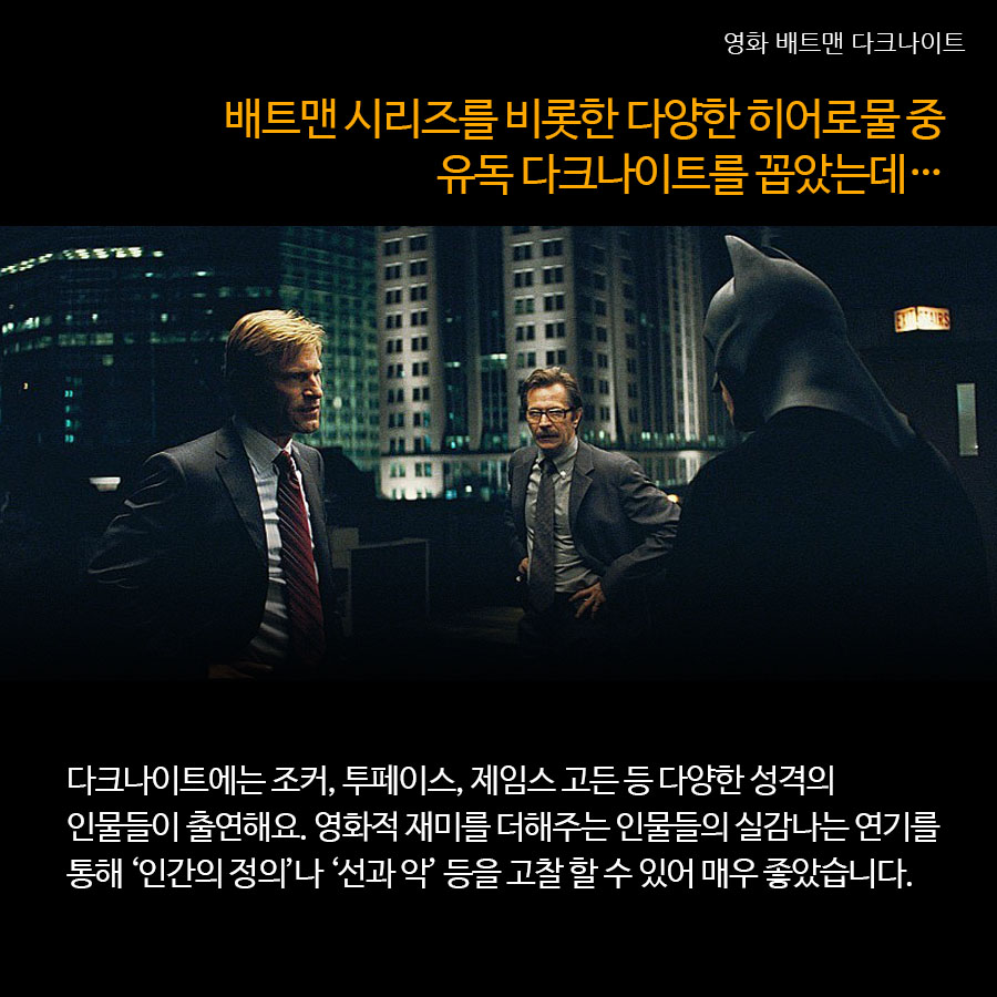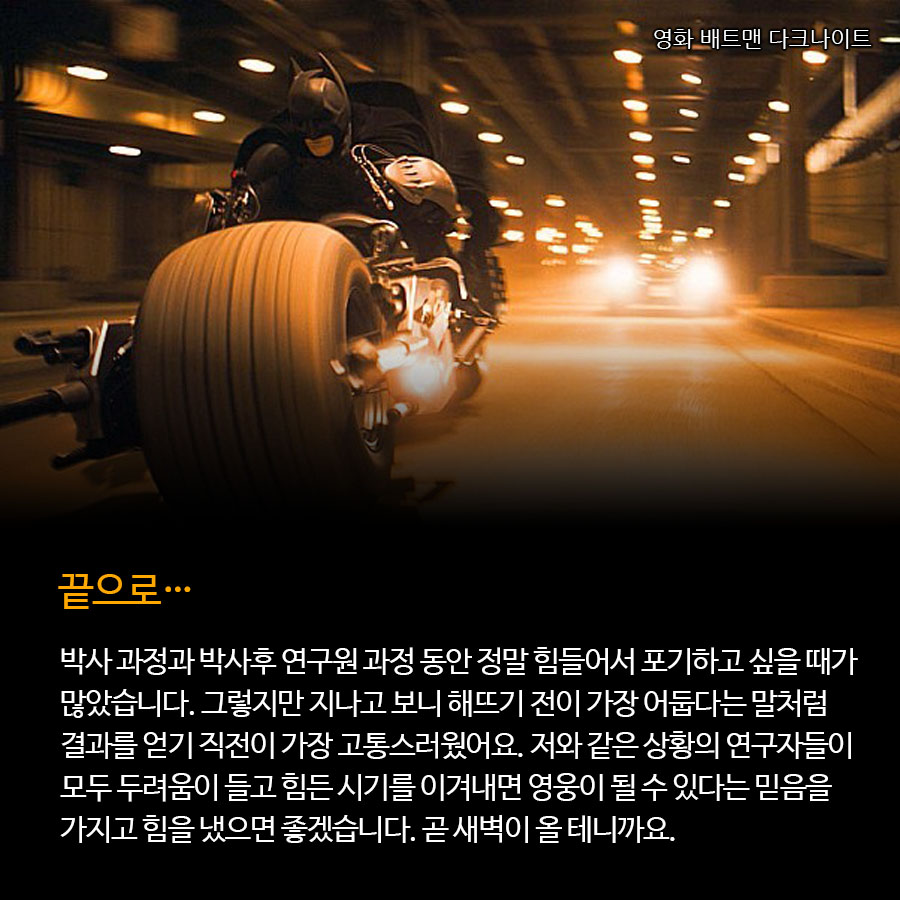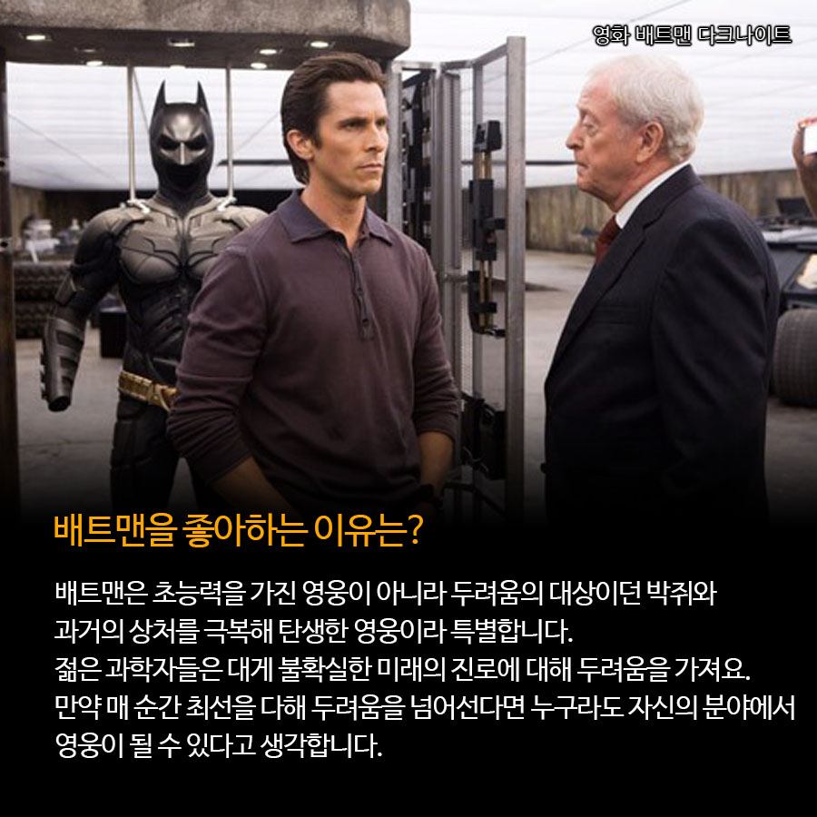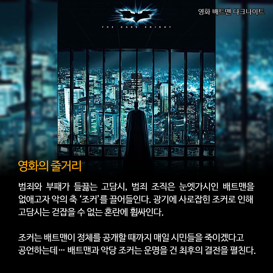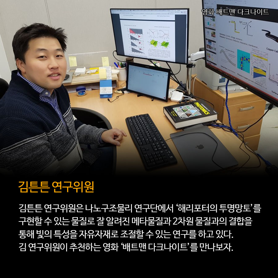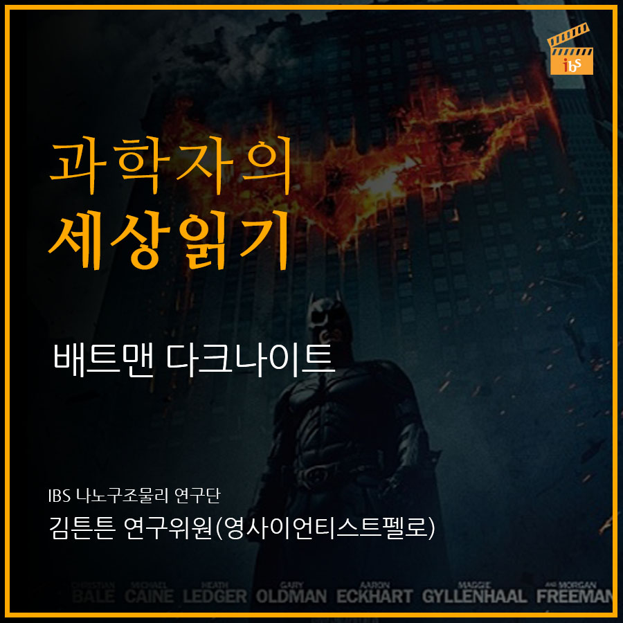배트맨 다크나이트과학자의 세상읽기, 배트맨 다크나이트. IBS 나노구조물리 연구단 김튼튼 연구위원(영사이언티스트펠로). 영화의 줄거리, 범죄와 부패가 들끓는 고담시, 범죄 조직은 눈엣가시인 배트맨을 없애고자 악의 축 '조커'를 끌어들인다. 광기에 사로잡힌 조커로 인해 고담시는 걷잡을 수 없는 혼란에 휩싸인다. 조커는 배트맨이 정채를 공개할 때까지 매일 시민들을 죽이겠다고 공언하는데... 배트맨과 악당 조커는 운명을 건 최후의 결전을 펼친다.