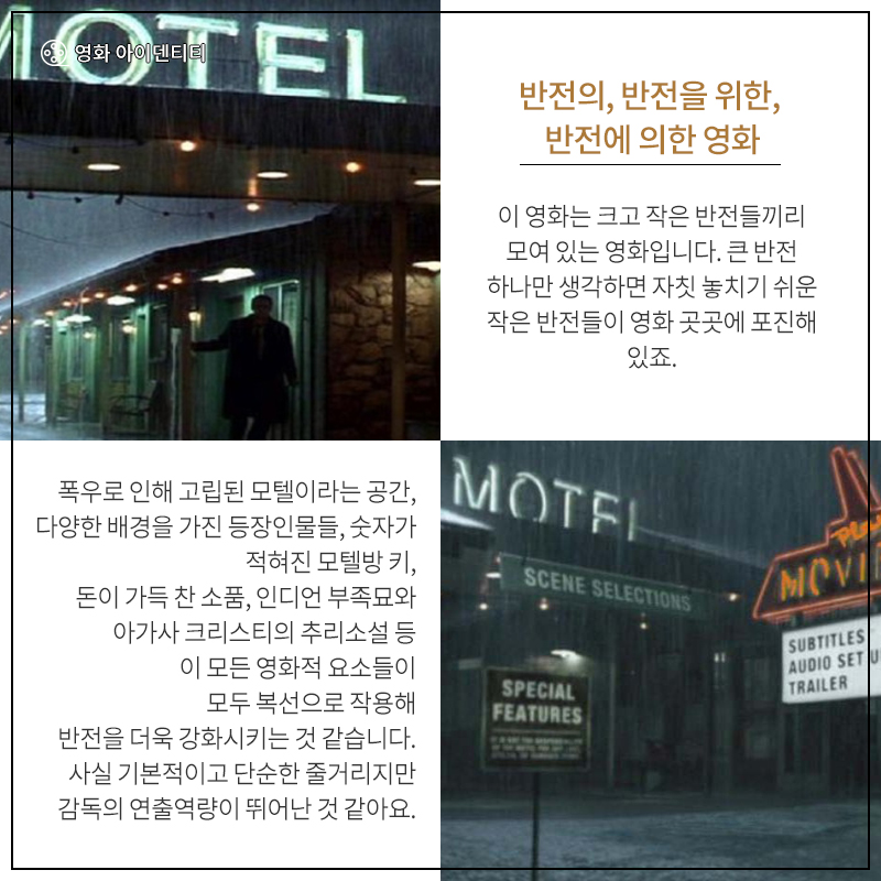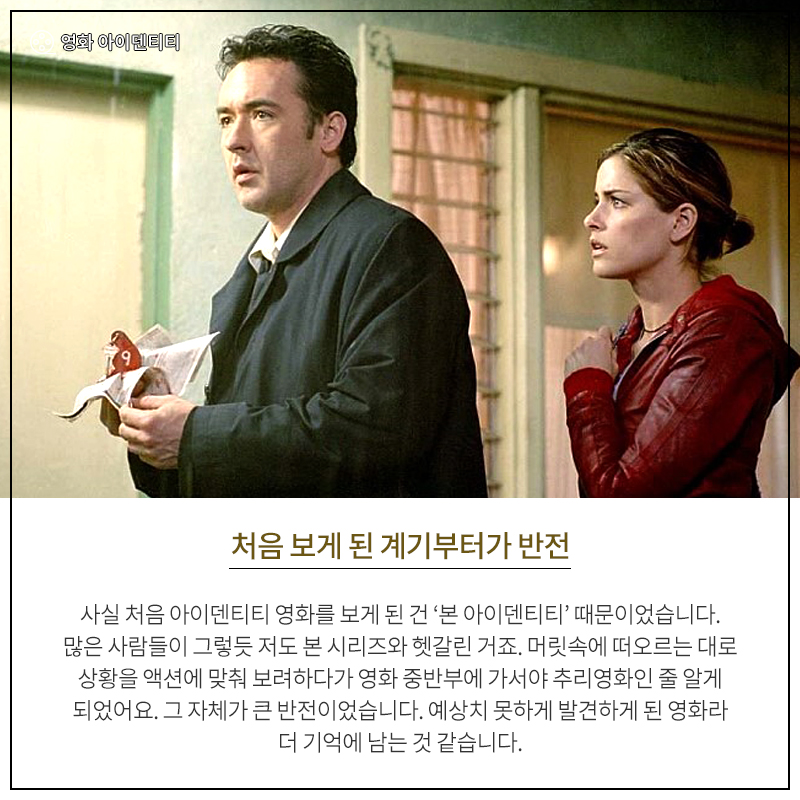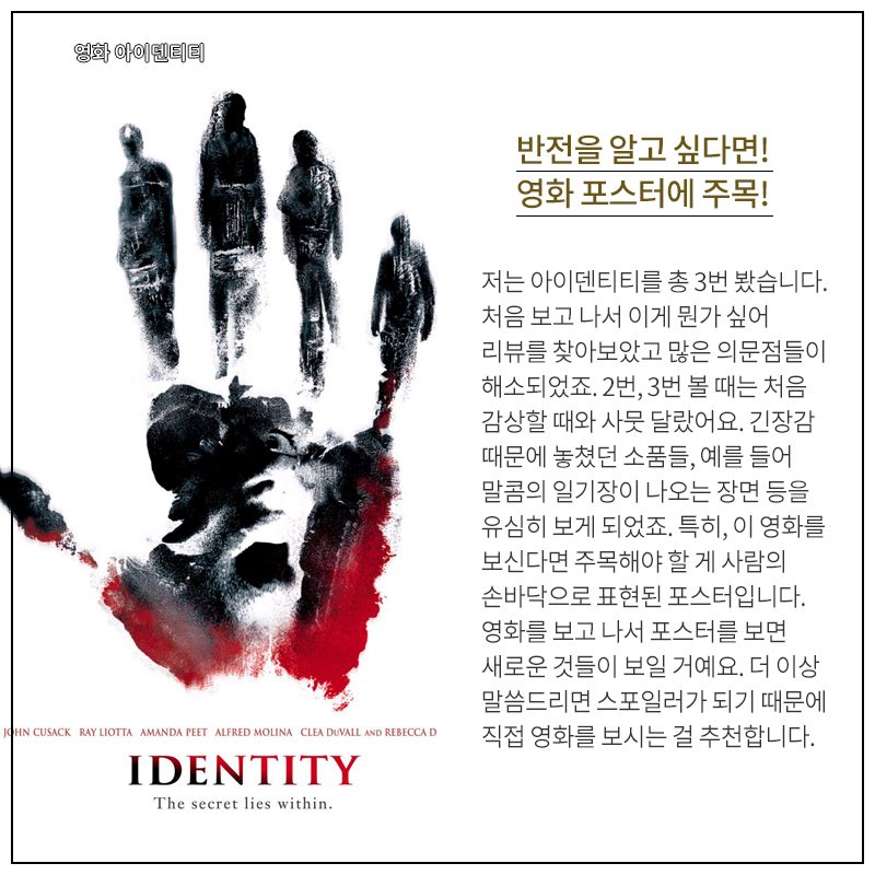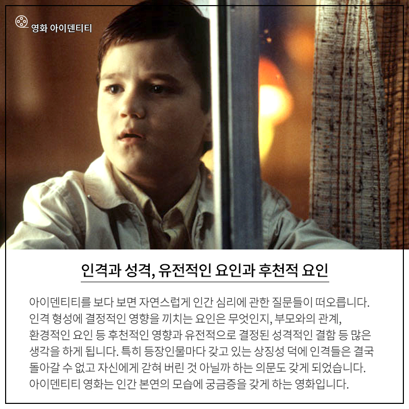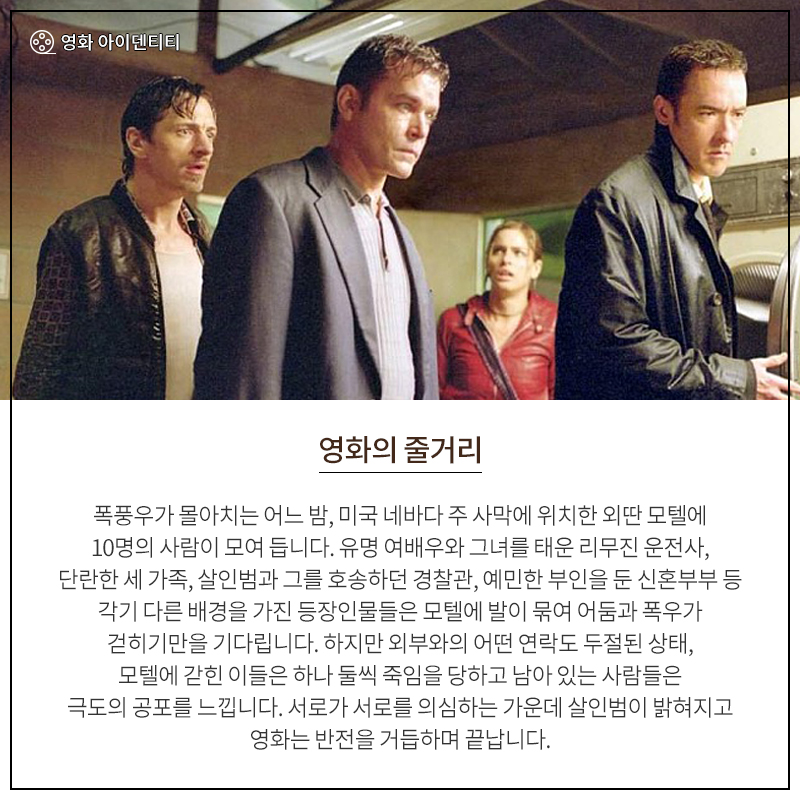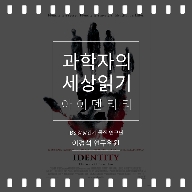 [과학자의 세상읽기] 영화 - 아이덴티티과학자의 세상읽기, 아이덴티티. IBS 강상관계 물질 연구단 이경석 연구원. 영화의 줄거리, 폭풍우가 몰아치는 어느 밤, 미국 네바다 주 사막에 위치한 외딴 모텔에 10명의 사람이 모여 듭니다. 유명 여배우와 그녀를 태운 리무진 운전사, 단란한 세 가족, 살인범과 그를 호송하던 경찰관, 예민한 부인을 둔 신혼부부 등 각기 다른 배경을 가진 등장인물들은 모텔에 발이 묶여 어둠과 폭우가 걷히기만을 기다립니다. 하지만 외부와의 어떤 연락도 두절된 상태, 모텔에 갇힌 이들은 하나 둘씩 죽임을 당하고 남아 있는 사람들은 극도의 공포를 느낍니다. 서로가 서로를 의심하는 가운데 살인범이 밝혀지고 영화는 반전을 거듭하며 끝납니다.