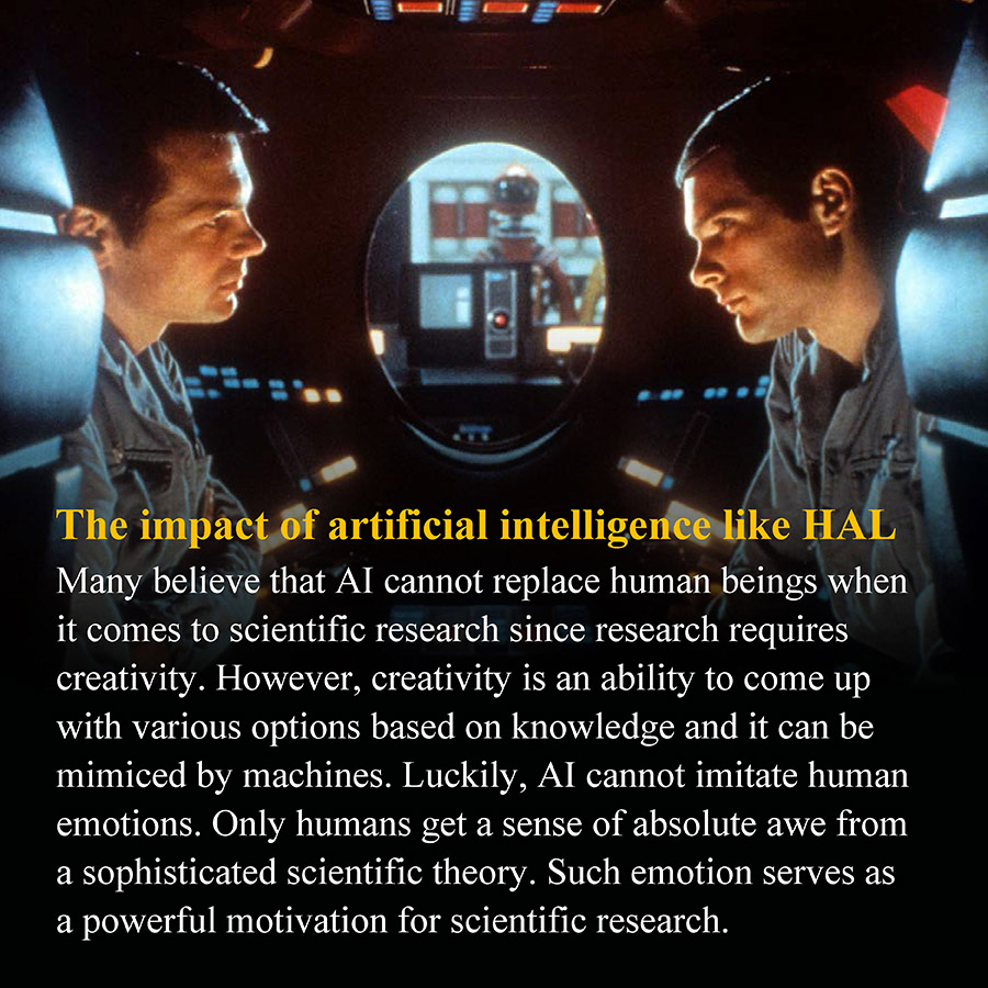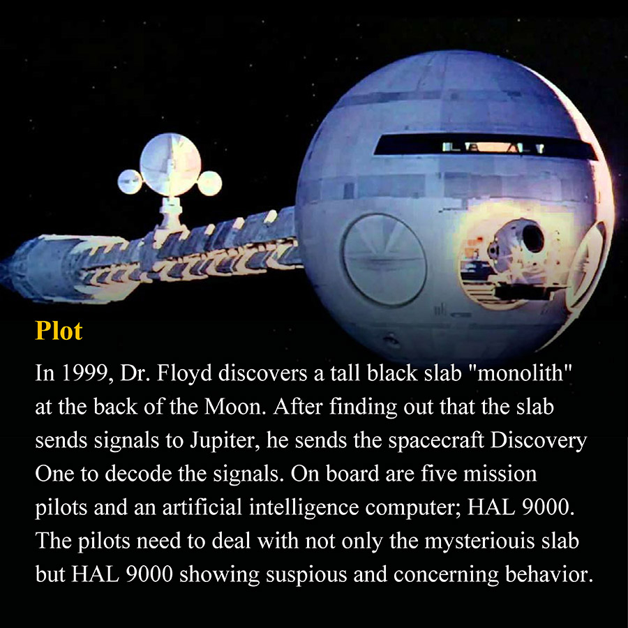 2001:A Space Odyssey (1968)In 1999, Dr. Floyd discovers a tall black slab "monolith" at the back of the Moon. After finding out that the slab sends signals to Jupiter, he sends the spacecraft Discovery One to decode the signals. On board are five mission pilots and an artificial intelligence computer; HAL 9000. The pilots need to deal with not only the mysteriouis slab but HAL 9000 showing suspious and concerning behavior.
