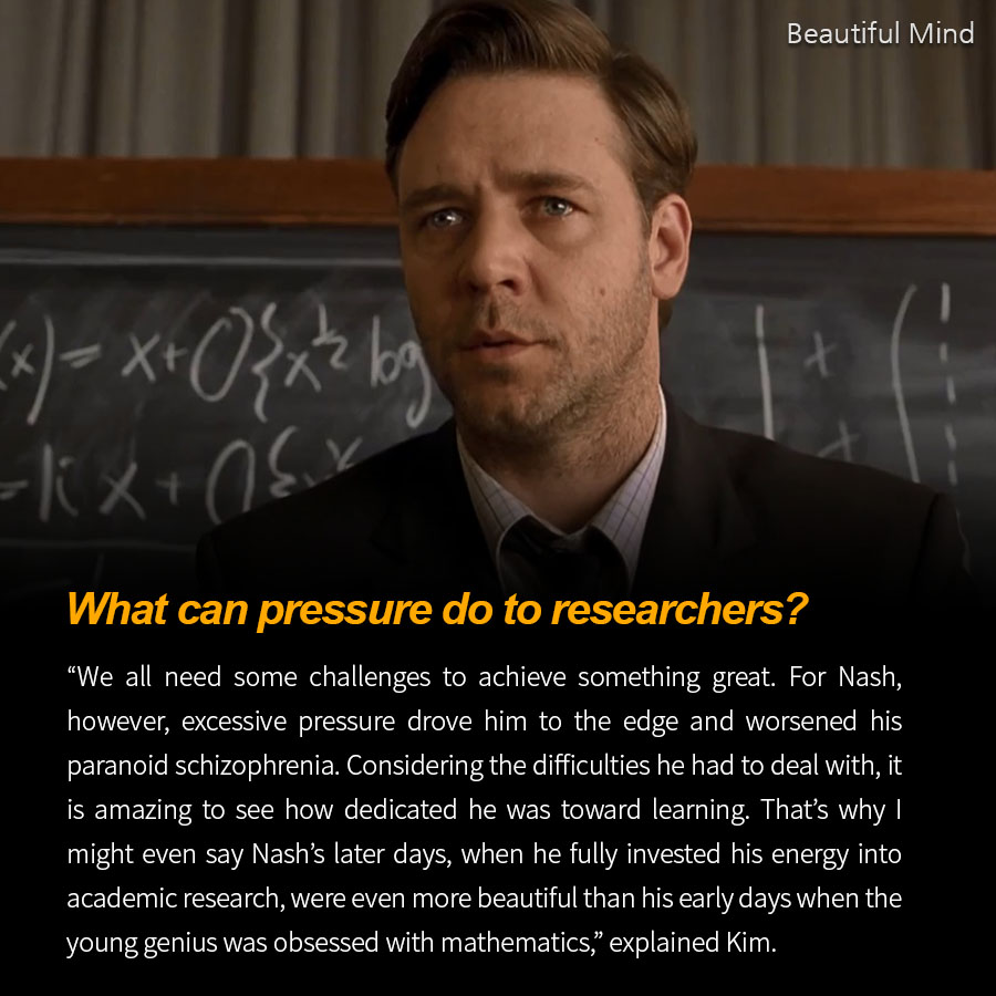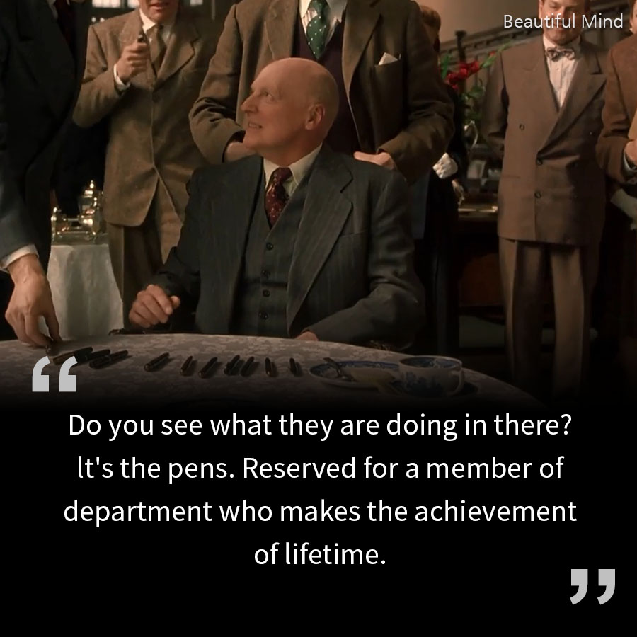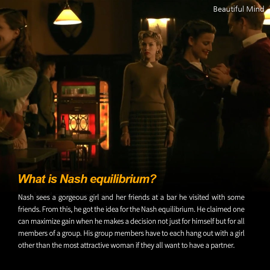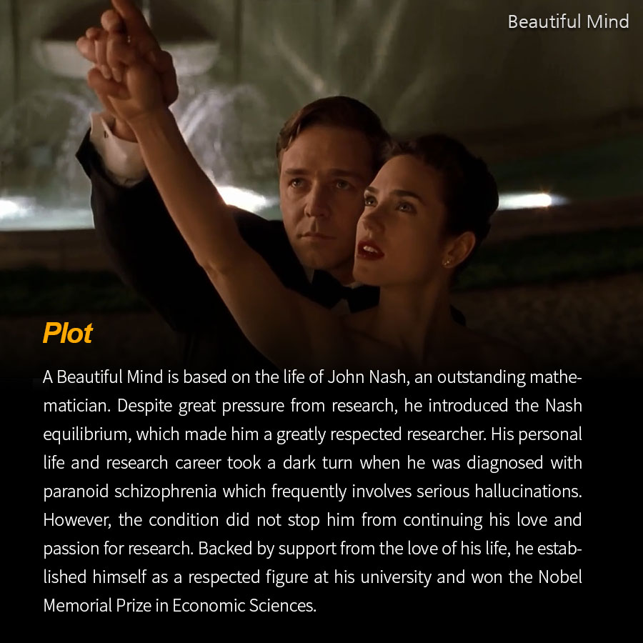 A Beautiful Mind is based on the life of John Nash, an outstanding mathematician. Despite great pressure from research, he introduced the Nash equilibrium, which made him a greatly respected researcher. His personal life and research career took a dark turn when he was diagnosed with paranoid schizophrenia which frequently involves serious hallucinations. However, the condition did not stop him from continuing his love and passion for research. Backed by support from the love of his life, he established himself as a respected figure at his university and won the Nobel Memorial Prize in Economic Sciences.
