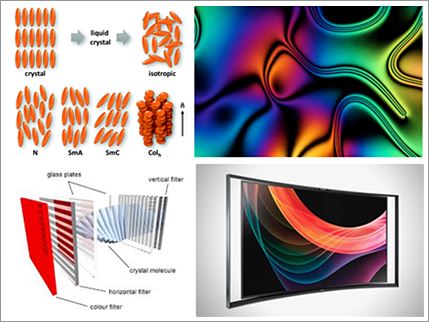 우리 일상에 익숙한 액정은 연성물질이다. 연성물질은 말 그대로 부드러운 물질을 말한다. 고체와 액체 중간에 해당하며 분자 사이의 결합에너지가 낮아 외부 자극에 쉽게 반응한다. 액정의 발견은 약 100여 년 전으로 거슬러 올라간다. 1888년 오스트리아 식물학자 프리드리히 리차드 라이니처(Friedrich Richard Reinitzer)가 식물의 콜레스테롤 성분을 분석하던 중 발견했다. 이 물질은 상온에서는 투명한 액체지만 145도로 가열하면 불투명해지고, 179도에 이르면 다시 투명한 액체가 된다. 녹는점이 두 개인 것이다. 액정이라는 이름은 독일의 물리학자 오토 레만(Otto Lehman)이 붙였다. 특수 편광 현미경으로 액체처럼 보이나 고체결정처럼 편광된 빛에 의해 영향을 받는 물질을 관찰하던 중 ‘액체(liquid)와 결정(crystal) 중간 상태’를 액정이라 명명했다. 이후 독일의 D 포르랜더(D. Vorlander)는 화학 분야 연구로 많은 액정 물질을 합성했다. 1920년 무렵에는 약 250종 이상의 액정 물질이 보고되었다. 별다른 응용기술이 없던 액정 연구는 1960년대 새로운 전기를 맞는다. 1963년 미국 웨스팅하우스사의 J.L. 퍼거슨(J.L. Ferguson)이 액정을 사용해 서모그래피(Thermography, 물체 표면의 농도를 색의 변화로 측정하는 방법)를 고안하고, 1968년 미국 RCA사의 G.H. 헤일마이어(Heilmeier)가 전기장 속에서 액정이 뿌옇게 흐려지는 것을 발견하며 활발해졌다. 1970년대 이후 전자손목시계, 전자계산기 등에 적용되기 시작했고 지난 수십 년간 TV, 모니터 등 디스플레이 분야의 핵심소재로 급부상했다. 특히 최근 2~30년 동안 디스플레이 기술이 눈부시게 발전했다. 분자의 배열이나 구동원리에 따라 매번 새로운 액정디스플레이(LCD)가 등장하며 산업의 판도가 바뀌기도 했다. 3D TV는 물론 곡면형태의 디스플레이까지 기술이 점진적으로 성장하고 있다. 액정의 활용이 디스플레이의 산업을 이끈 것이다. 이렇게 빠른 시간 내 액정물질이 디스플레이 산업의 필수소재가 된 이유가 뭘까? 액정 자체의 특성에 다시 주목해보자. 액정 분자 배열은 불규칙하면서도 규칙적이다. 어떤 방향으로는 불규칙한 액체 상태와 같지만 다른 방향으로는 규칙적인 결정 상태의 중간 형태이다. 전압과 온도에 따라 분자의 배열이나 결정 구조가 변하는 광학적 성질도 있다. 외부 자극에 반응하는 것이 강점을 이용해 투명한 전극이 부착된 얇은 유리관 사이에 액정 물질을 넣고 전기를 흘려보내면 빛이 난다. 액정 분자의 배열이 바뀌면서 빛을 통과시키기 때문이다. 전류의 세기에 따라 빛의 강약도 조절할 수 있다. 디스플레이의 소형화에는 액정 물질의 공이 컸다. 결과적으로 오늘 날 대형 디스플레이가 가정에 들어오게 된 건 액정 물질의 특이성에서 기인한 셈이다.