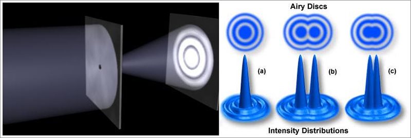 회절 현상 때문에 빛은 작은 틈을 지나 상으로 맺힐 때, 틈만한 또렷한 점이 아니라 아래 그림처럼 밝고 어두운 부분이 교대로 나타나는 원반(Airy disc) 모양이 된다. 현미경의 대물렌즈를 지나는 빛도 회절 현상을 일으킨다. 이 때문에 두 개의 물체를 보고자 할 때, 이 둘 사이가 매우 가까우면 원반처럼 퍼진 빛이 서로 겹쳐 보여 구분할 수가 없다. 회절 현상이 중요한 까닭은 가까이 있는 두 점을 구분할 수 있는 능력, 즉 ‘분해능(resolving power)’이 현미경의 해상도를 결정짓는 요소이기 때문이다. 광학현미경으로 물체를 얼마나 크게 확대해서 볼 지는 렌즈의 배율3)에 의해 결정된다. 하지만 배율만 높인다고 해서 물체를 자세히 관찰할 수 있는 것은 아니다. 사진을 거듭 확대 복사를 하면, 사진 크기 자체는 커지지만 이미지가 또렷해지지는 않는 것과 같다. 물체를 자세히 보고 싶으면 분해능이 좋아야 한다. 아베는 빛의 회절이 파장4)이 길수록, 빛이 통과하는 틈이 좁을수록 잘 일어나며 현미경으로 두 점을 구분하기 위해서는 두 점의 거리가 최소한 파장의 절반은 되어야 한다는 것을 밝혔다. 가시광선의 파장은 400~700㎚이기 때문에 광학현미경의 분해능은 최소 200㎚에서 최대 350㎚로 한계가 정해져 있다는 것이다. 바로 아베의 회절 한계다. 이러한 한계 탓에 세포의 전체적인 모습이나 세포 소기관의 대략적인 모습까지는 관찰할 수 있으나 일반적인 크기의 바이러스나 단일 단백질은 파악할 수 없다. 아베의 회절 한계는 백 년 넘게 절대 넘어설 수 없는 법칙으로 여겨졌다.