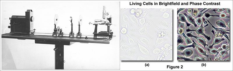 다양한 광학현미경의 종류광학현미경의 발전으로 생물학 등 다양한 과학 분야에서 큰 진전이 있었다. 그 때문에 획기적인 현미경을 발명한 사람은 종종 노벨상을 수상하기도 한다. 오스트리아의 과학자 리하르트 지그몬디(Richard Adolf Zsigmondy)는 한외현미경(Ultramicroscope)을 발명한 공로로 1925년 노벨 화학상을 받았다. 한외현미경은 틴들현상5)을 이용하여 보통 현미경으로는 관찰하기 어려운 미립자의 운동을 관찰할 수 있다. 1932년 네덜란드 물리학자 프리츠 제르니케(Frits Zernike)는 빛의 간섭 현상(간섭에 대한 설명은 위 그림 설명 참조)을 이용해 물체를 관찰하는 위상차현미경(phase contrast microscope)을 발명하여 1953년 노벨 물리학상 수상의 영예를 안았다. 대물렌즈를 통해 직접 들어온 빛과 시료를 통과하며 굴절된 빛이 만나면 간섭 현상이 생기는데, 위상차현미경은 이를 명암으로 바꿔 관찰하는 원리를 이용한다. 위상차현미경으로 살아있는 세포 등 무색투명한 생물 시료를 염색하지 않고도 관찰할 수 있다. 1950년대 중반 조지 노말스키(Gerge Nomarski)는 편광필름과 특수한 프리즘을 이용해 위상차현미경을 개선한 미분간섭현미경(Differential interference contrast(DIC) microscope)을 개발하기도 했다.