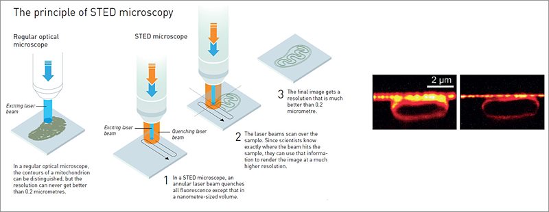 세 사람은 각각 다른 방식으로 회절한계를 극복했다. 먼저 슈테판 헬은 자극방출억제(Stimulated Emission Depletion(STED))라는 방법을 사용했다. 원리는 이렇다. 기존의 형광현미경처럼 시료에 형광 염료를 염색하여 레이저 빛을 쪼이면 들떠서 형광을 방출할 준비를 한다. 그 다음 다시 한 번 첫 번째 레이저를 쏜 부분과 완벽히 겹치되 가운데가 뻥 뚫린 도넛 모양의 레이저를 다시 시료에 쏘면, 도넛 레이저를 맞은 부분은 형광 빛 방출이 억제되고 가운데 뻥 뚫린 아주 작은 중심부의 형광만 뚜렷하게 관측된다. 이 도넛 구멍 같은 공간을 나노 단위로 줄이고 초점 위치를 조금씩 옮기면서 측정한 수많은 이미지를 하나로 합치면 나노 단위의 물질도 아주 선명하게 관찰할 수 있다는 것이다. 슈테판 헬은 1994년 이러한 현미경을 이론으로 입증해 발표했고 2000년에는 실제로 만든 현미경으로 대장균을 관측해 그 영상을 공개했다.