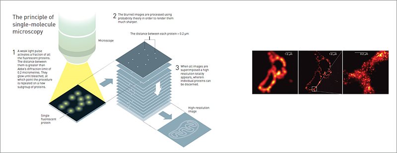 미국의 과학자들은 ‘단일분자현미경’이라는 것을 개발하는 데 기여했다. 머너는 1997년 특정 파장의 빛을 쏘면 세포 안의 형광 단백질 분자 속에서 형광 빛을 나게 했다가 나지 않게 했다가 할 수 있음을 발견했다. 베치그는 2007년 세포 안에 있는 여러 형광 단백질들 중 특정 단백질의 빛을 낼 수 있는 파장의 빛을 쏜 후 사진을 찍고, 또 다른 파장의 빛을 쏘아 다른 형광단백질의 빛을 발하게 하여 사진을 찍는 방법을 여러 번 반복하였다. 이렇게 모은 사진들을 모아 하나의 선명한 영상으로 볼 수 있게 했다.