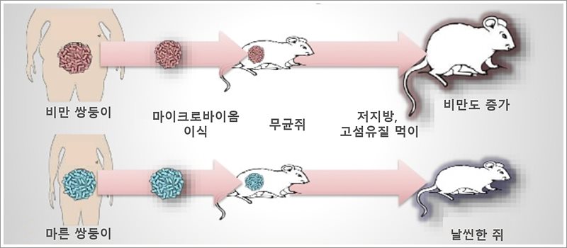그 시작은 2006년 미국 워싱턴대학교 제프리 고든 박사의 ‘무균 쥐 실험’이었다. 고든 박사는 체내에 미생물이 없는 무균 쥐에게 뚱뚱한 쥐와 마른 쥐의 대변을 각각 주입해 관찰해 보았다. 그랬더니 같은 양의 먹이를 먹어도 뚱뚱한 쥐의 대변이 주입된 쥐의 체중이 마른 쥐의 대변이 주입된 쥐보다 2배나 더 늘어난 것을 발견했다. 장내 미생물이 소화와 영양 흡수를 도울 뿐 아니라 비만과 같은 질병에도 영향을 준다는 것을 밝힌 것이다. 이 연구 결과는 저명한 학술지 <네이처>지에 실려 전세계적으로 큰 반향을 일으켰다. 이후 장내 미생물총에 대한 연구가 봇물 터지듯 쏟아졌고 지금까지 미생물총이 비만, 당뇨와 같은 대사성 질환은 물론 아토피, 류마티스관절염 같은 면역 질환, 우울증, 자폐증과 같은 정신질환3), 파킨슨병과 같은 신경계 질환, 암, 골다공증, 노화 등 과 밀접한 관계가 있다는 사실이 밝혀졌다.4)