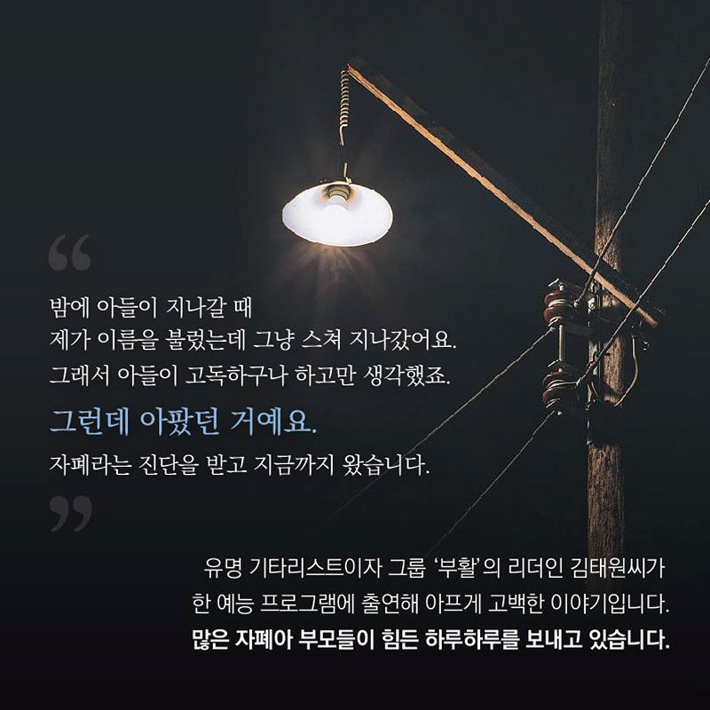 "밤에 아들이 지나갈 때 제가 이름을 불렀는데 그냥 스쳐 지나갔어요. 그래서 아들이 고독하구나 하고만 생각했죠. 그런데 아팠던 거에요. 자폐라는 진단을 받고 지금까지 왔습니다." 유명 기타리스트이자 그룹 '부활'의 리더인 김태원씨가 한 예능 프로그램에 출연해 아프게 고백한 이야기입니다. 많은 자폐아 부모들이 힘든 하루하루를 보내고 있습니다.