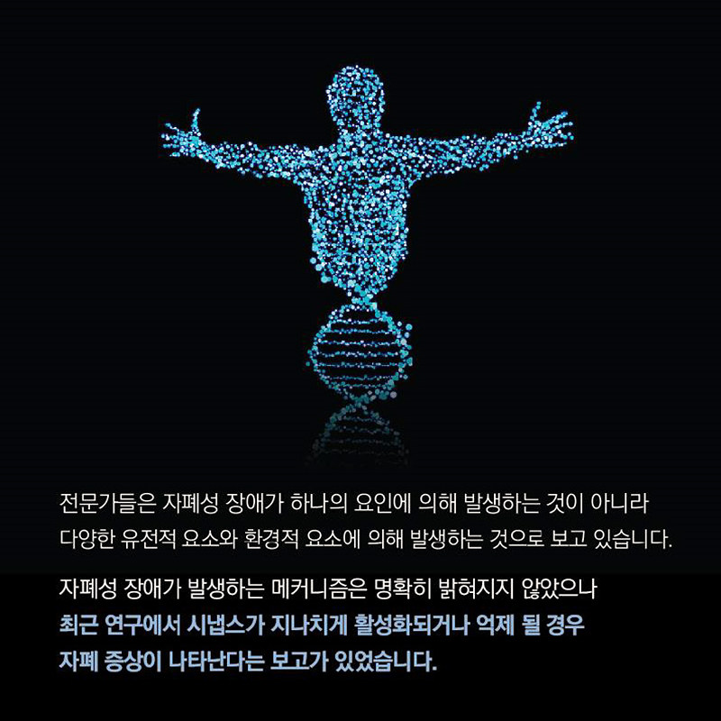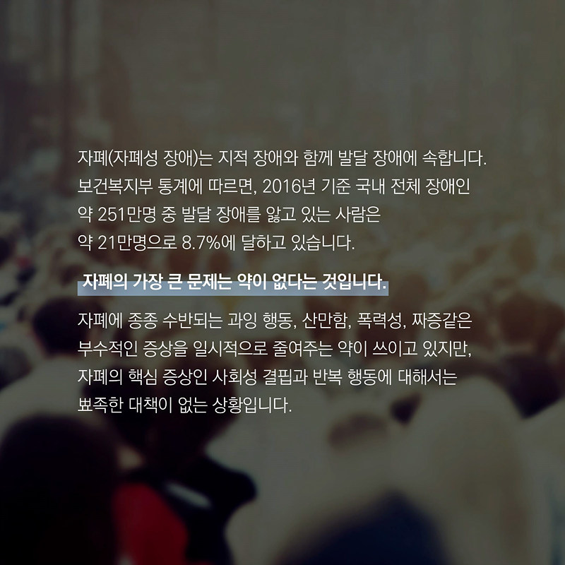 자폐(자폐성 장애)는 지적 장애와 함께 발달 장애에 속합니다. 보건복지부 통계에 따르면, 2016년 기준 국내 전체 장애인 약 251만명 중 발달 장애를 앓고 있는 사람은 약 21만명으로 8.7%에 달하고 있습니다. 자폐의 가장 큰 문제는 약이 없다는 것입니다. 자폐에 종종 수반되는 과잉 행동, 산만함, 폭력성, 짜증같은 부수적인 증상을 일시적으로 줄여주는 약이 쓰이고 있지만, 자폐의 핵심 증상인 사회성 결핍과 반복 행동에 대해서는 뾰족한 대책이 없는 상황입니다.