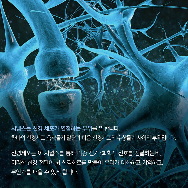 시냅스는 신경 세포가 연접하는 부위를 말합니다. 하나의 신경세포 축삭돌기 말단과 다음 신경세포의 수상돌기 사이의 부위입니다. 신경세포는 이 시냅스를 통해 각종 전기·화학적 신호를 전달하는데, 이러한 신경 전달이 뇌 신경회로를 만들어 우리가 대화하고 기억하고, 무언가를 배울 수 있게 합니다.