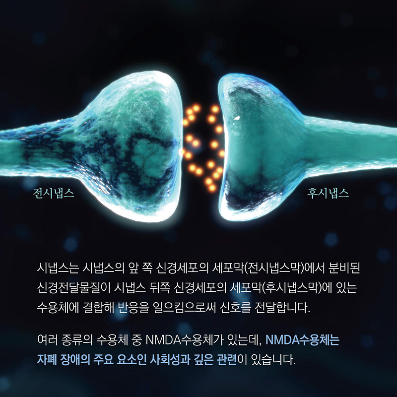 시냅스는 시냅스의 앞 쪽 신경세포의 세포막(전시냅스막)에서 분비된 신경전달물질이 시냅스 뒤쪽 신경세포의 세포막(후시냅스막)에 있는 수용체에 결합해 반응을 일으킴으로써 신호를 전달합니다. 여러 종류의 수용체 중 NMDA수용체가 있는데, NMDA수용체는 자폐 장애의 주요 요소인 사회성과 깊은 관련이 있습니다.