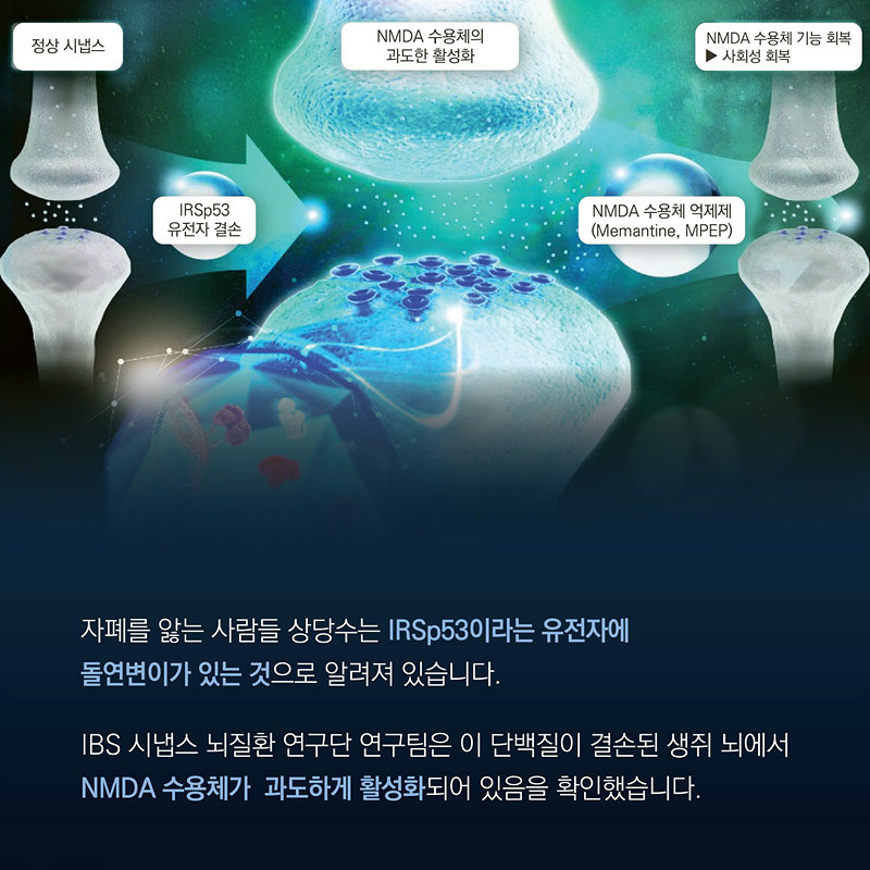 자폐를 앓는 사람들 상당수는 IRSp53이라는 유전자에 돌연변이가 있는 것으로 알려져 있습니다. IBS 시냅스 뇌질환 연구단 연구팀은 이 단백질이 결손된 생쥐 뇌에서 NMDA 수용체가 과도하게 활성화되어 있음을 확인했습니다.