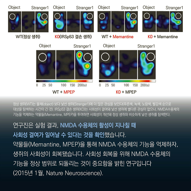 연구진은 실험 결과, NMDA 수용체의 활성이 지나칠 때 사회성 결여가 일어날 수 있다는 것을 확인했습니다. 약물들(Memantine, MPEP)을 통해 NMDA 수용체의 기능을 억제하자, 생쥐의 사회성이 회복됐습니다. 사회성 회복을 위해 NMDA 수용체의 기능을 정상 범위로 되돌리는 것이 중요함을 밝힌 연구입니다(2015년 1월, Nature Neuroscience).