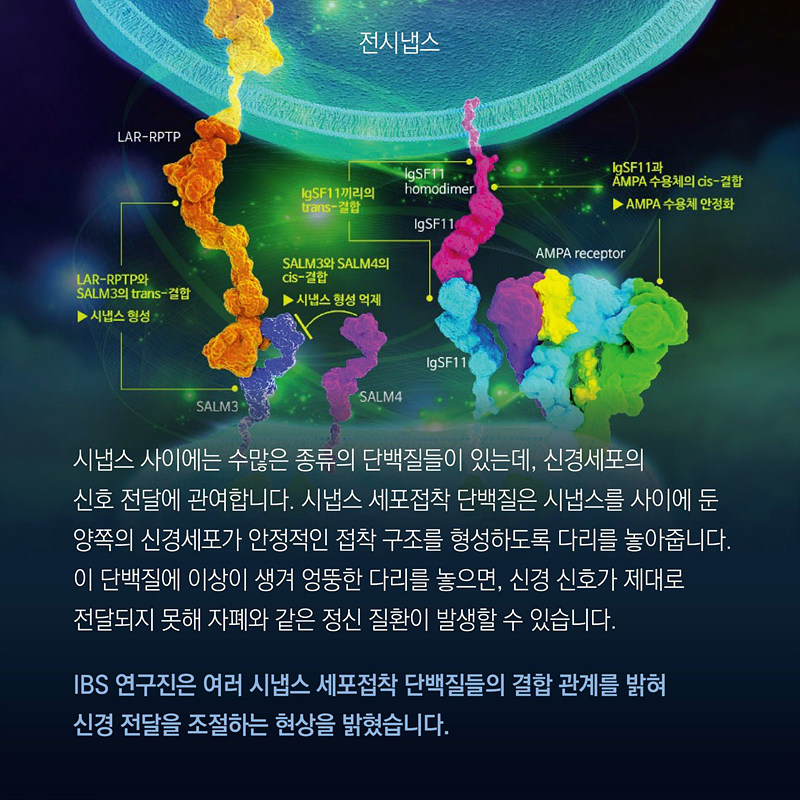 시냅스 사이에는 수많은 종류의 단백질들이 있는데, 신경세포의 신호 전달에 관여합니다. 시냅스 세포접착 단백질은 시냅스를 사이에 둔 양쪽의 신경세포가 안정적인 접착 구조를 형성하도록 다리를 놓아줍니다. 이 단백질에 이상이 생겨 엉뚱한 다리를 놓으면, 신경 신호가 제대로 전달되지 못해 자폐와 같은 정신 질환이 발생할 수 있습니다. IBS 연구진은 여러 시냅스 세포접착 단백질들의 결합 관계를 밝혀 신경 전달을 조절하는 현상을 밝혔습니다.