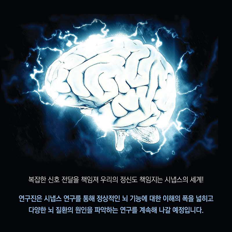 복잡한 신호 전달을 책임져 우리의 정신도 책임지는 시냅스의 세계! 연구진은 시냅스 연구를 통해 정상적인 뇌 기능에 대한 이해의 폭을 넓히고 다양한 뇌 질환의 원인을 파악하는 연구를 계속해 나갈 예정입니다.