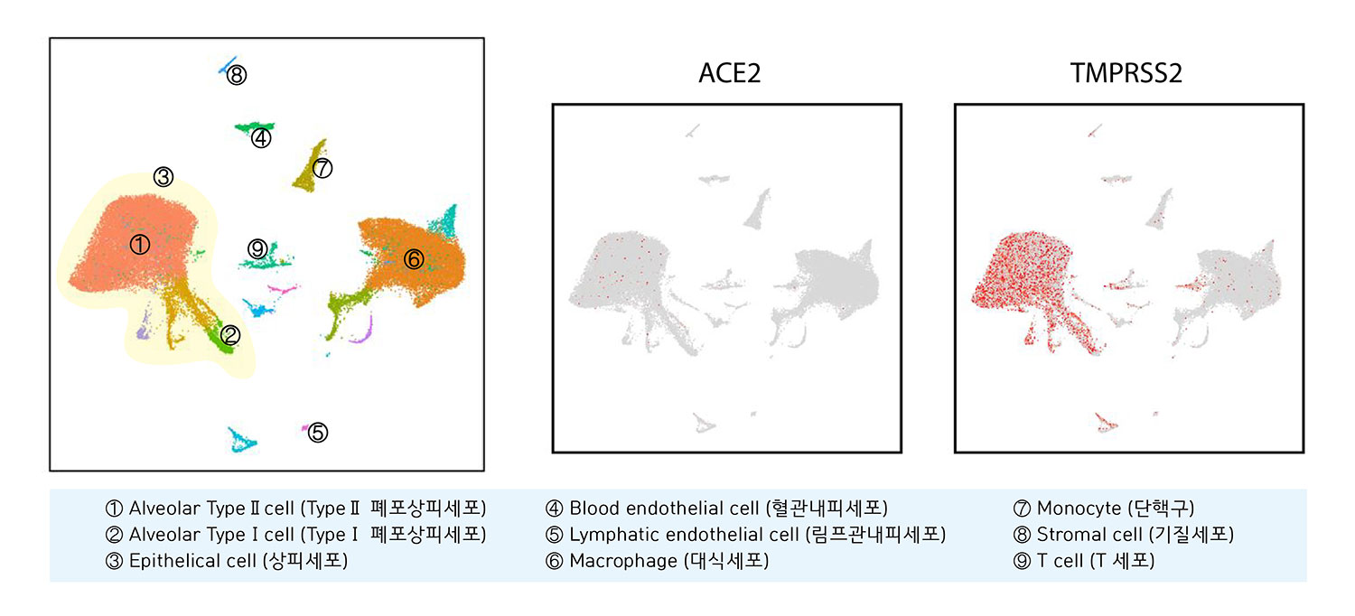 ▲ 양명진 연구원은 공개된 GSE122960 유전정보에 근거해 성인 8명에게서 채취한 4만1082개 폐세포의 단일 세포 유전자발현을 분석했다. 2019-nCoV가 인지하는 효소 중 하나인 ACE2(가운데 그림)는 TypeⅡ 폐포 세포에서만 특이적으로 발현되는 반면, 바이러스 단백질을 가공하여 세포 내 침입을 가속화하는 효소인 TMPRSS2(오른쪽 그림)는 폐 상피세포 전반에 걸쳐 높게 발현(붉은 점)되는 양상을 보인다.