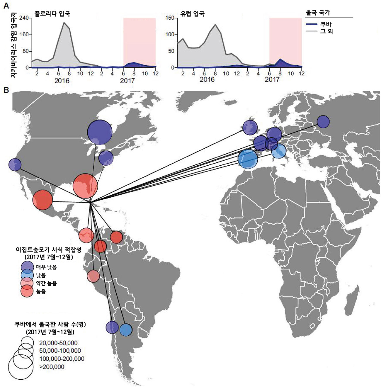 2017년 6월~12월 감염 입국자의 98% 이상이 쿠바에서 출국했다는 점을 토대로 해당 기간 쿠바에 대규모 발병이 있었을 것으로 추정했다. 또한 지카 바이러스 매개체인 이집트숲모기가 서식하기 적합하며, 쿠바에서 입국한 사람이 2만 명이 넘는 국가들을 선별해 지카바이러스 추가 발병 위험이 있다고 경고했다(B). [5]