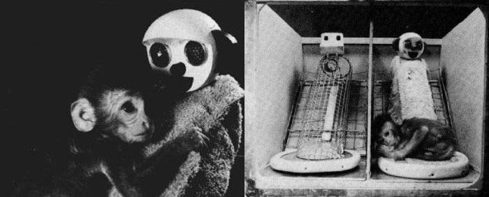▲ 해리 할로우의 가짜 원숭이 실험. 새끼 원숭이는 철사 엄마(왼쪽)와 헝겊 엄마(오른쪽) 중 포근한 품을 가진 헝겊 엄마에게 더 애착을 보였다. [출처: Wikipedia]