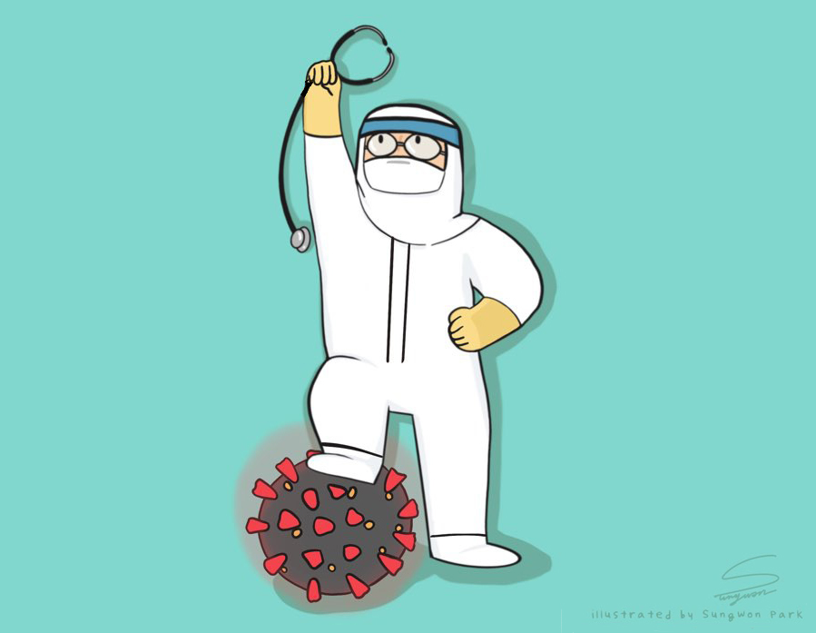 ▲ 공동 필진인 박재형 충남대병원 내과 교수의 딸인 박성원 양이 사스코로나바이러스-2와 싸우는 아빠의 모습을 떠올리며 그렸다. [그림: 박성원]