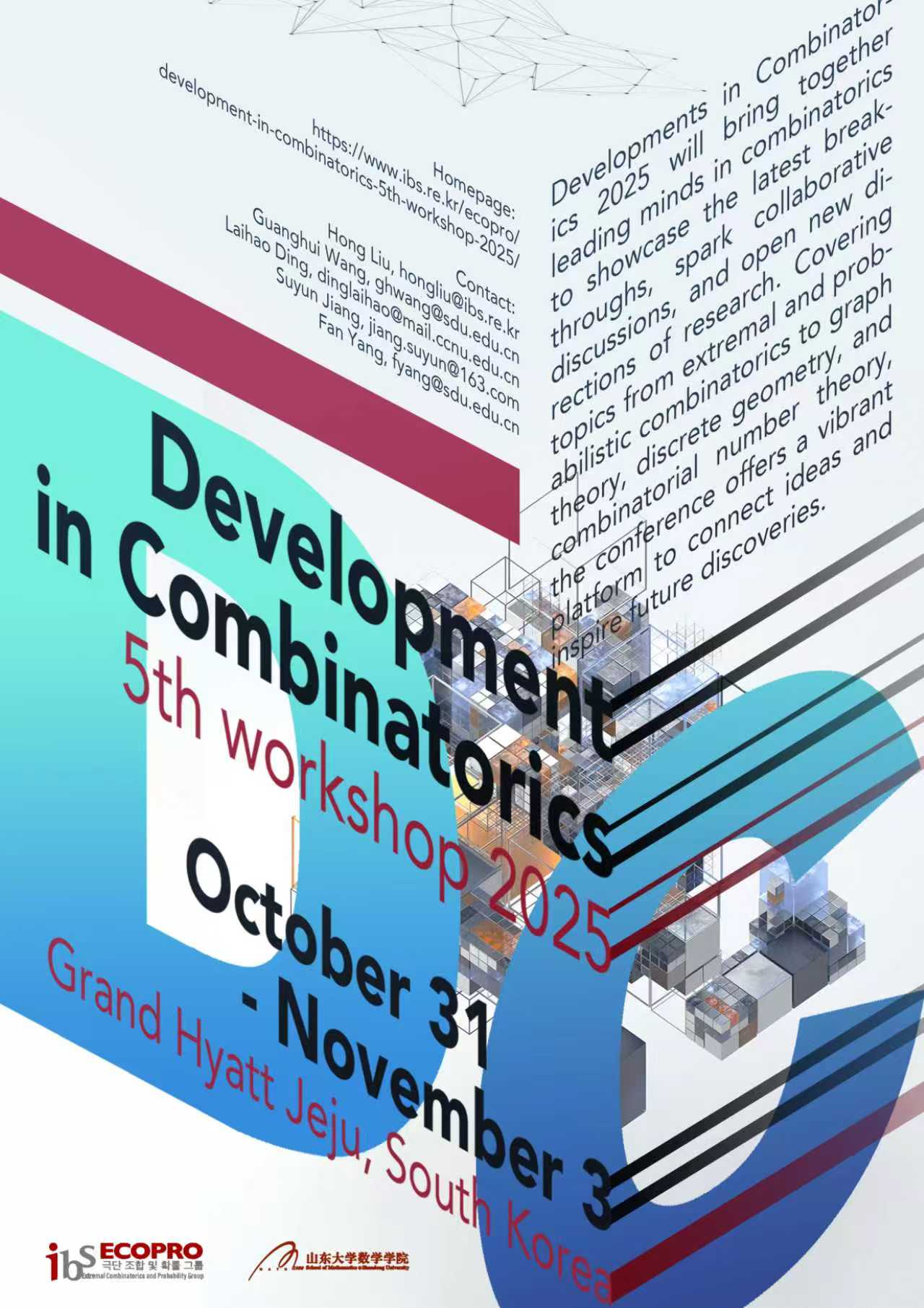 The 5th workshop Developments in Combinatorics will be held offline from October 31 to November 3, 2025. DC 2025 will bring together leading minds in combinatorics to showcase the latest breakthroughs, spark collaborative discussions, and open new directions of research. Covering topics from extremal and probabilistic combinatorics to graph theory, discrete geometry, and combinatorial number theory, the conference offers a vibrant platform to connect ideas and inspire future discoveries.