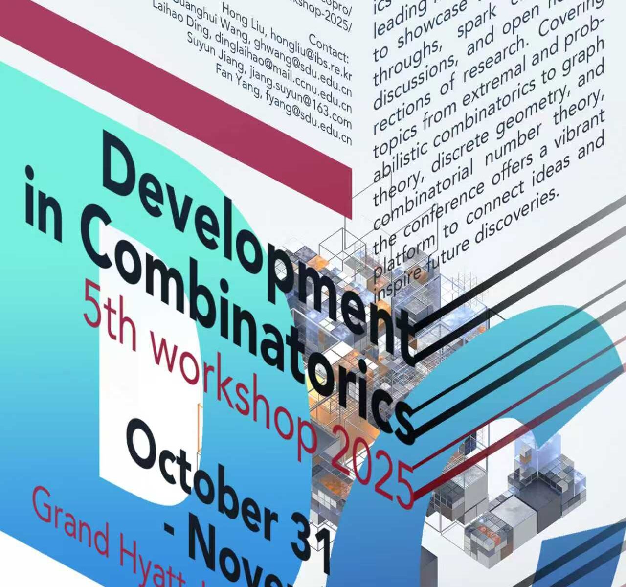 The 5th workshop Developments in Combinatorics will be held offline from October 31 to November 3, 2025. DC 2025 will bring together leading minds in combinatorics to showcase the latest breakthroughs, spark collaborative discussions, and open new directions of research. Covering topics from extremal and probabilistic combinatorics to graph theory, discrete geometry, and combinatorial number theory, the conference offers a vibrant platform to connect ideas and inspire future discoveries.
